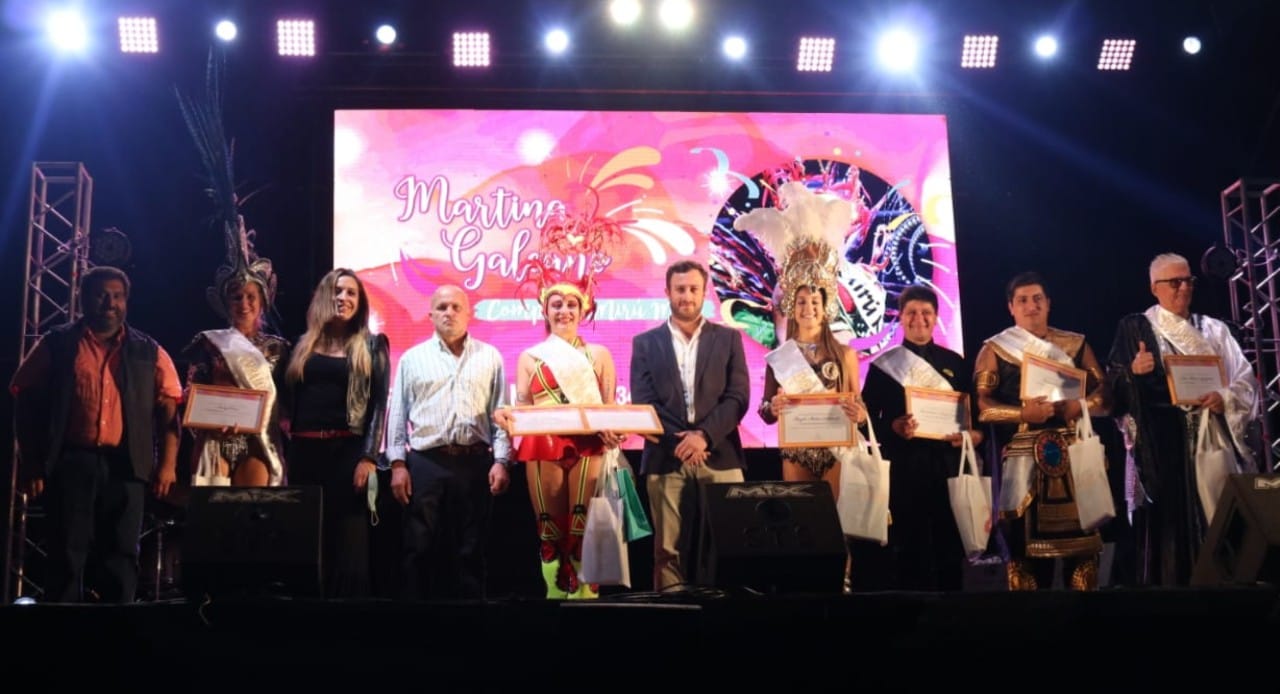 El Intendente Hernán Ralinqueo; la Directora Nacional de Fiestas Argentinas, Fernanda Rodríguez; el Presidente de la Comisión Institucional de Fiestas Populares, Marcelo Muñoz y funcionarios les colocaron la bandas a todos los embajadores y finalmente la Embajadora Cultural del Carnaval de la Provincia.