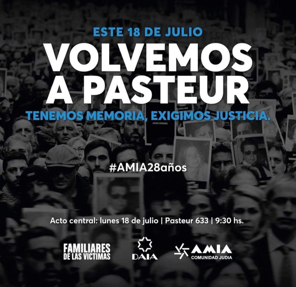Bajo la consigna “Volvemos a Pasteur”, la conmemoración se realizará este lunes a las 9.53 frente a la sede de la mutual judía. De esta manera el acto por el 28 aniversario del atentado a la Asociación Mutual Israelita Argentina (AMIA) vuelve a ser presencial luego de haberse realizado durante dos años de forma virtual a raíz de la pandemia de COVID-19.