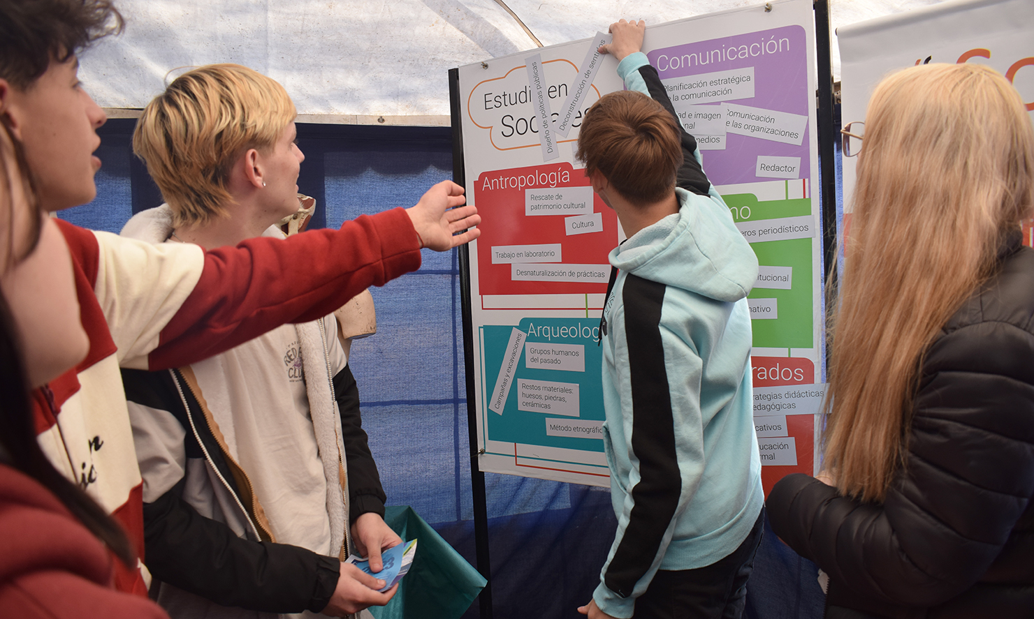 En el stand de FACSO, los y las estudiantes se encontraron con diversas propuestas didácticas para conocer la oferta académica. Por un lado, a través de un juego se invitó a quienes se acercaban a unir palabras clave con las carreras de Comunicación, Periodismo, Antropología, Arqueología y los profesorados de Comunicación y Antropología. La actividad fue un espacio oportuno para conocer los intereses y conocimientos de los y las jóvenes, quienes se llevaron un obsequio de regalo.