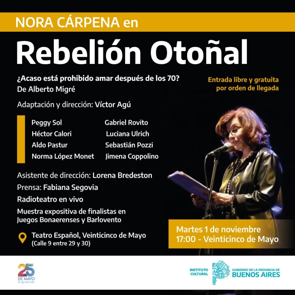 La Directora de Adultos Mayores, Constancia Maio, informó que el próximo martes 1 de noviembre por gestiones realizadas por el Municipio ante el Instituto Cultural de la Provincia actuarán en el Teatro Español artistas de primera línea como Nora Cárpena en la obra “Rebelión Otoñal”.