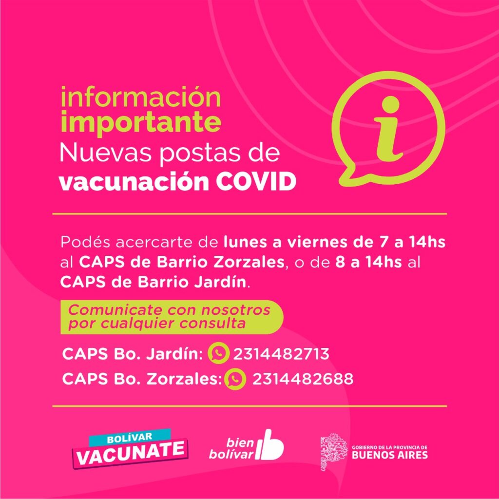 La Secretaría de Salud de Bolívar recomienda a la población que tenga incompleto los esquemas con las dosis anteriores, que se acerquen a completarlas a las nuevas postas de vacunación ubicadas en los CAPS de Barrio Zorzales y Barrio Jardín.