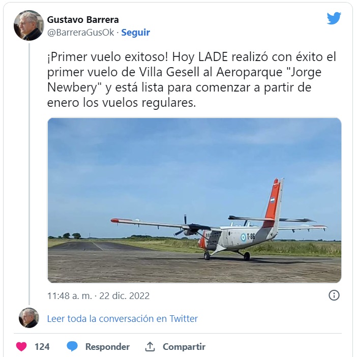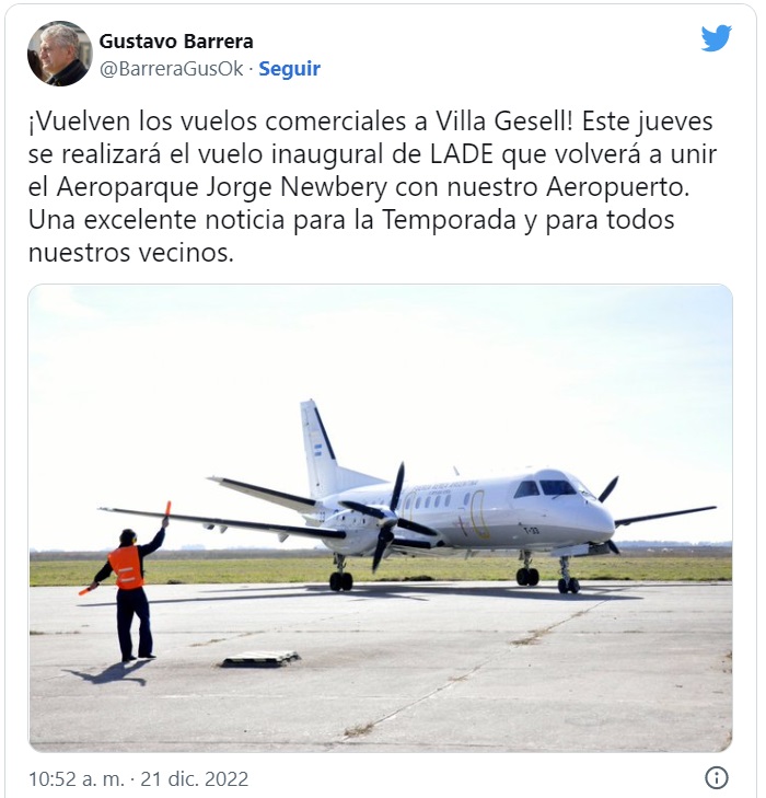 El intendente de Villa Gesell, Gustavo Barrera, anunció el retorno de los vuelos comerciales a la localidad. Además, destacó que ya se realizó el primer viaje para determinar cuestiones logísticas y a su vez anunció que el próximo martes se comunicarán precisiones.