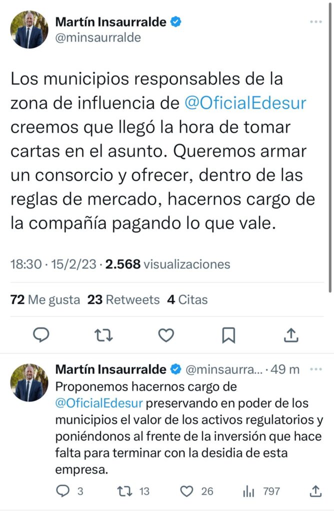 “Los municipios responsables de la zona de influencia de Edesur creemos que llegó la hora de tomar cartas en el asunto”, aseguró Insaurralde y agregó: “Queremos armar un consorcio y ofrecer, dentro de las reglas de mercado, hacernos cargo de la compañía pagando lo que vale, preservando en poder de municipios el valor de los activos regulatorios y poniéndonos al frente de la inversión que hace falta para terminar con la desidia de esta empresa”.