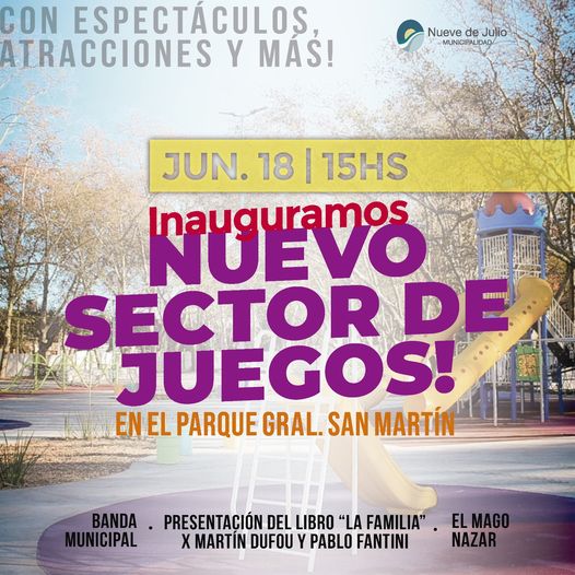 La Municipalidad de Nueve de Julio procederá a inaugurar hoy, desde las 15 hs., los trabajos de remodelación y puesta en valor del sector de juegos del Parque General San Martín, que abarcaron la totalidad de este espacio, en la esquina de Avda. Mitre y Tomás Cosentino.