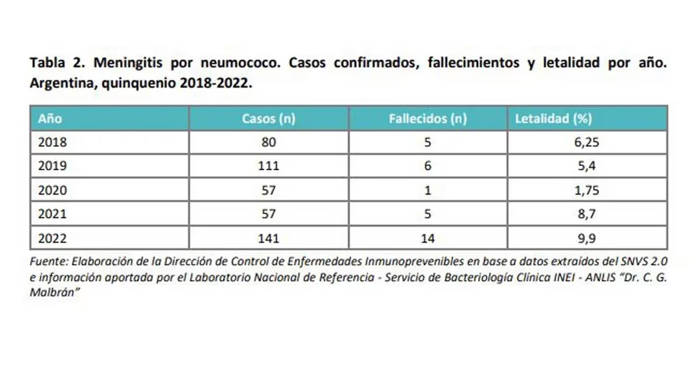 Sin embargo, en 2022 “se evidenció un aumento en el número de casos de meningitis neumocócica en la mayoría de los grupos etarios respecto de los datos obtenidos en los últimos años”, más del doble respecto de los registrados cada año en el bienio 2020-2021 y en un 27% más que los notificados en 2019.