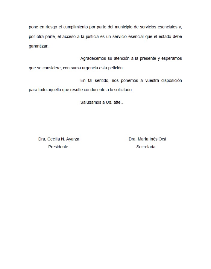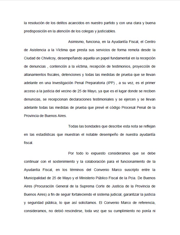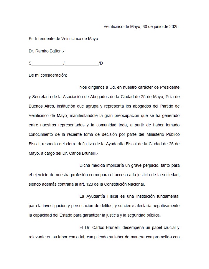 “Nos dirigimos a Ud. en nuestro carácter de Presidente y Secretaria de la Asociación de Abogados de la Ciudad de 25 de Mayo, Pcia. de Buenos Aires, institución que agrupa y representa los abogados del Partido de Veinticinco de Mayo, manifestándole la gran preocupación que se ha generado entre nuestros representados y la comunidad toda, a partir de haber tomado conocimiento de la reciente toma de decisión por parte del Ministerio Público Fiscal, respecto del cierre definitivo de la Ayudantía Fiscal de la Ciudad de 25 de Mayo, a cargo del Dr. Carlos Brunelli.