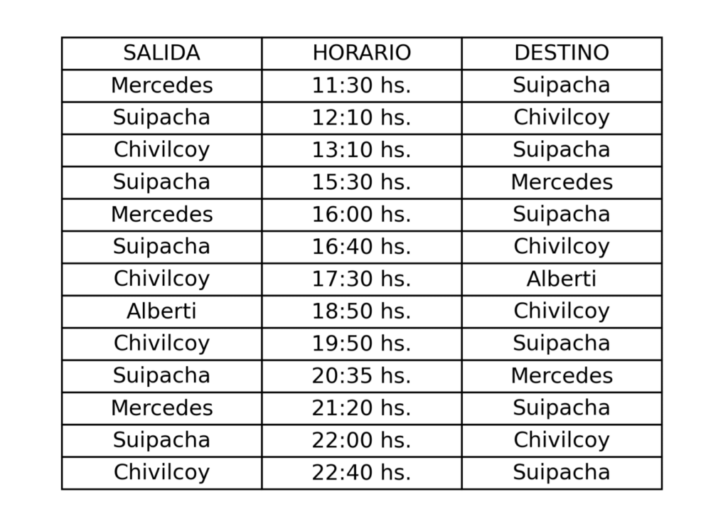 Uno de los aspectos que se observa en la nueva programación es que ya no habrá servicios durante las primeras horas del día. De acuerdo a la grilla publicada, la primera salida está prevista a las 11.30 desde Mercedes con destino a Suipacha.